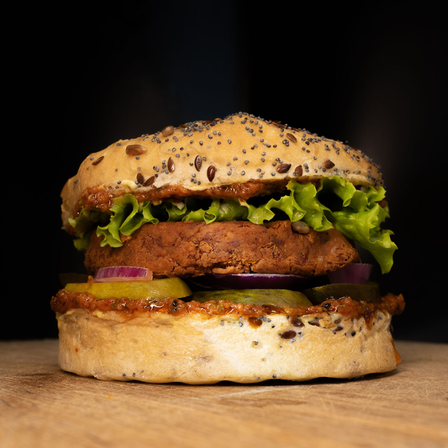 Pain maison du Zoo au sésame et pétales de maïs croustillants, galette à la patate douce ou nuggets (Mozza et panure), sauce Ketchup du Zoo, salades, oignons rouges, cornichons